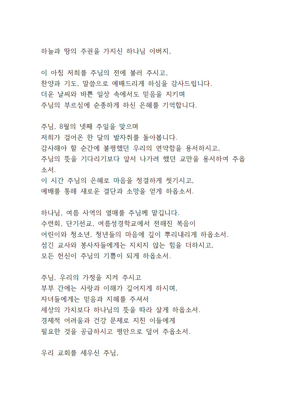 이번 글에서는 8월 넷째주일 낮예배 대표기도문을 안내해 드리겠습니다.