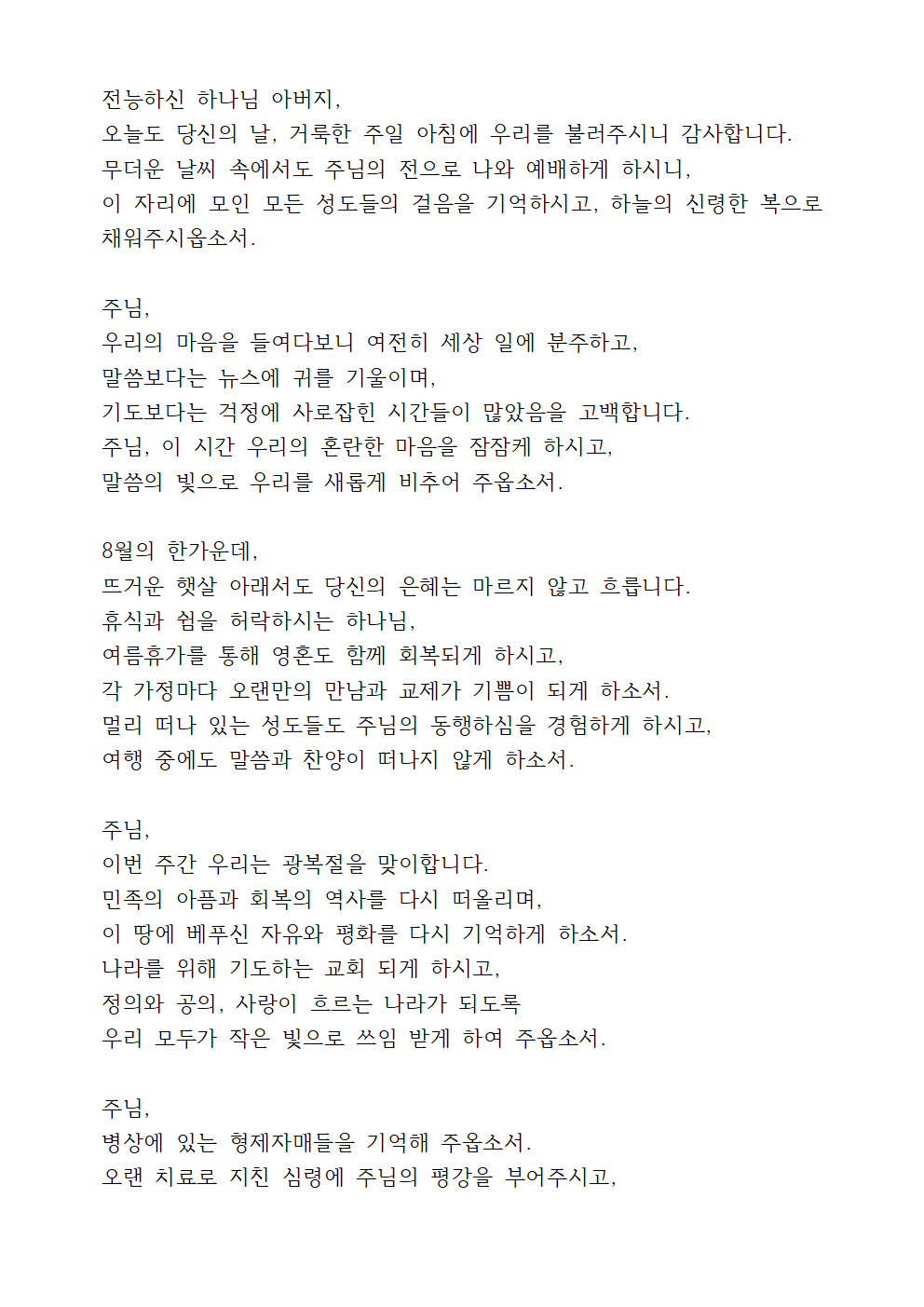 이번 글에서는 8월 둘째주일 대표기도문을 안내해 드리겠습니다.
